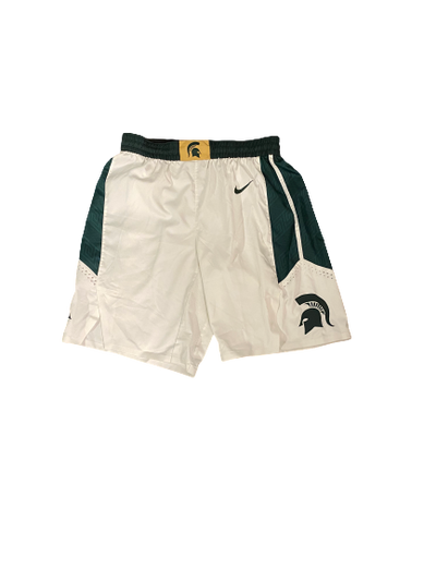 These game-worn shorts were worn by Cassius Winston on February 20th, 2019. The Michigan State Spartans faced the Rutgers Scarlet Knights at the Breslin Center. Cassius was a leading force in the game and helped propel the Spartans to a 71-60 victory. He finished the game with 28 points, 8 assists, and 5 rebounds.