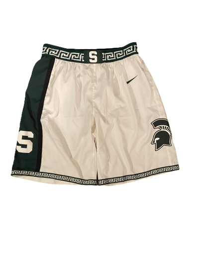 Cassius Winston wore these game-worn throwback shorts on March 8th, 2020. The Michigan State Spartans faced the Ohio State Buckeyes at the Breslin Center. Cassius led the team to an 80-69 win with 27 points, 6 assists, and 4 rebounds.