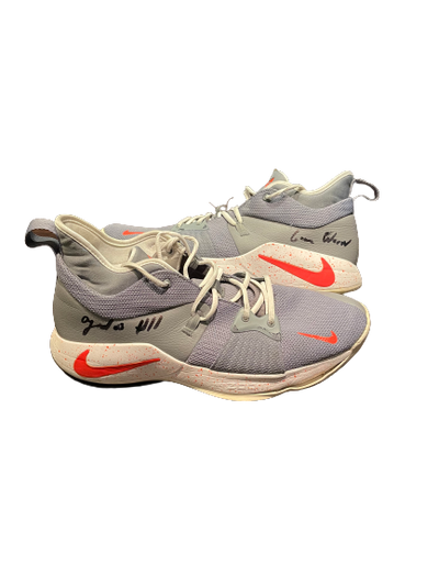 The shoes were worn by Ayo during his career at Illinois. He signed and inscribe them.