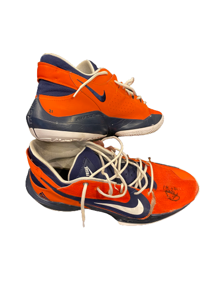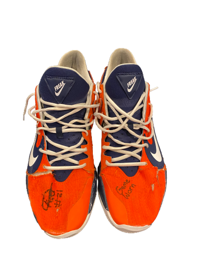 These shoes were worn many times throughout Kofi's career at Illinois, as reflected in the condition of the shoes, which truly show usage!