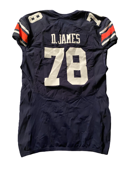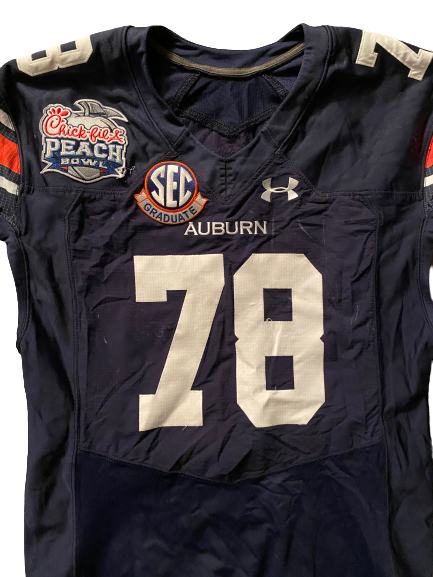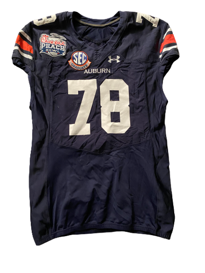 This jersey was worn by Darius James on January 1st, 2018. The Auburn Tigers faced the UCF Knights. It was the 50th edition of the Peach Bowl, and the first Peach Bowl to be played in Mercedes-Benz Stadium, after spending the previous 25 editions in the now demolished Georgia Dome. Uniform features bowl patch and rare SEC graduate patch.