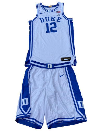 This uniform set was worn by Javin DeLaurier throughout the 2019-2020 season. In a truly unique season, Javin helped lead the Blue Devils to a 25-6 record. He was voted a team captain for the second straight season and appeared in all 31 games. His leadership and effort on the court earned him the respect of his teammates and coaches. Javin was an integral part in the Duke Blue Devils success over the past four seasons.