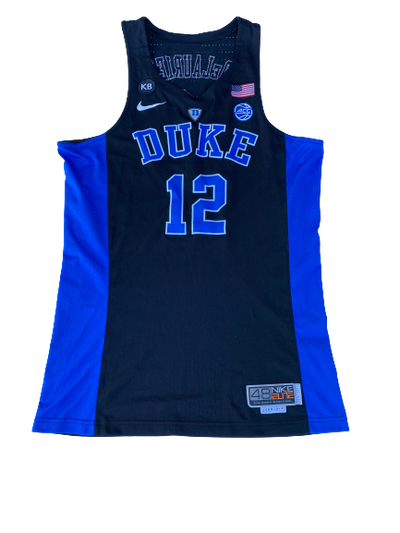 This jersey was worn by Javin DeLaurier on December 10th, 2016. The Duke Blue Devils faced the UNLV Rebels at T-Mobil Arena. The Blue Devils came in as the #7 ranked team in the country and won in large fashion on the road, 94-45.